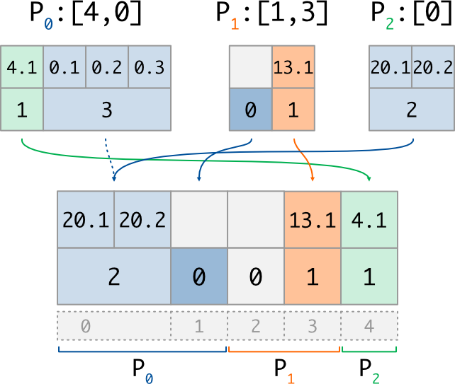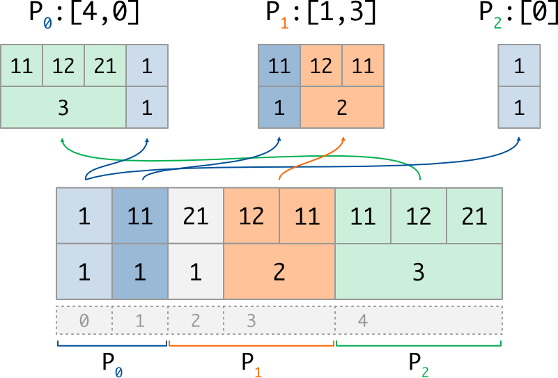 # 0 1 2 3 4 # Global Index c = [1, 1, 1, 2, 3 ] # Counts d = array([1, 11, 21, 12, 11, 11, 12, 21], dtype=int) # Buffer